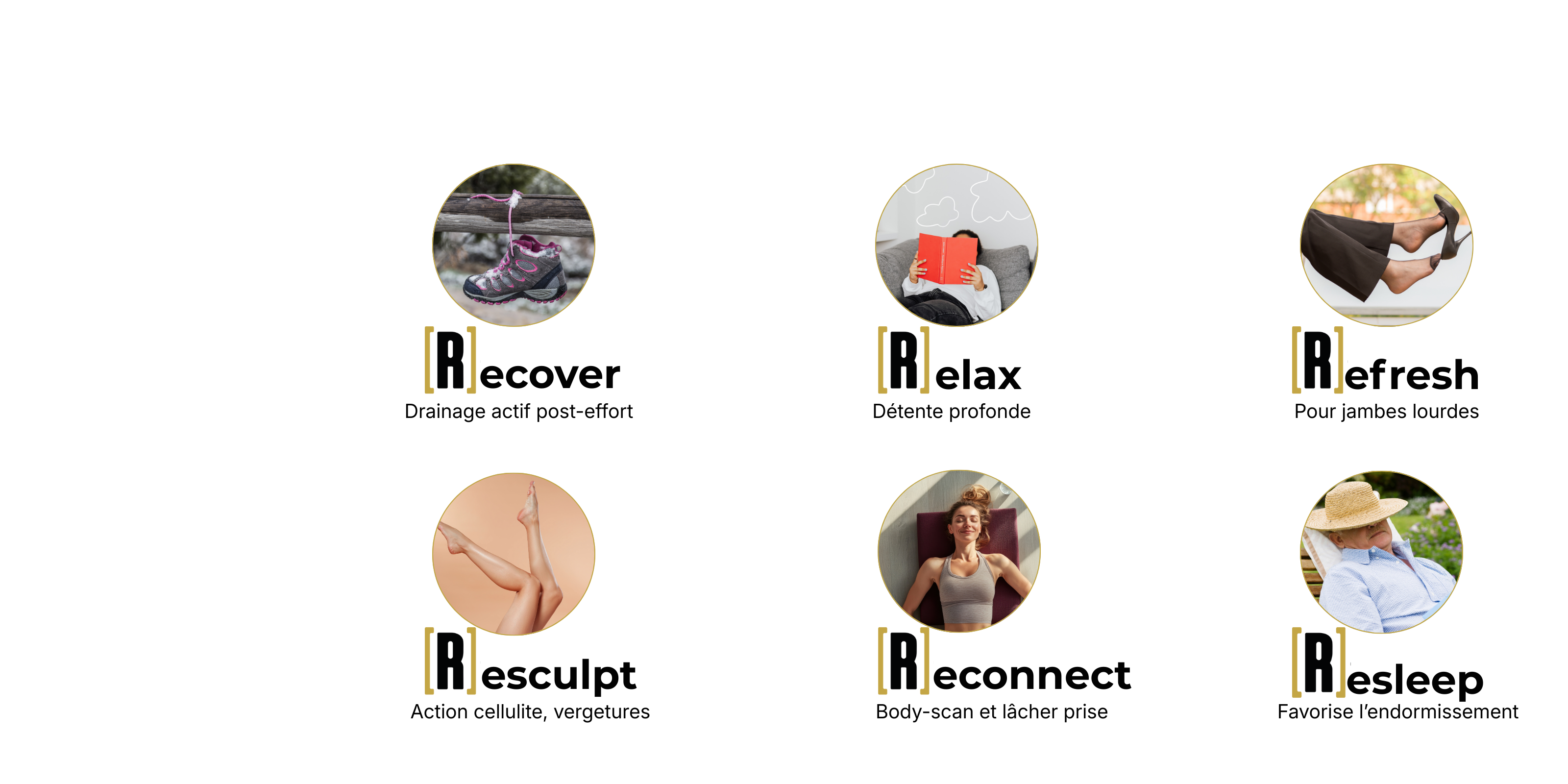6 Programmes : [R]ecover, [R]elax, [R]efresh, [R]esculpt, [R]esleep, [R]econnect